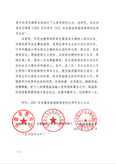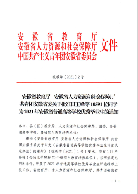 安徽省教育厅 安徽省人力资源和社会保障厅 共青团安徽省委关于批准田玉峰等10591位同学为2021年安徽省普通高等学校优秀毕业生的通知